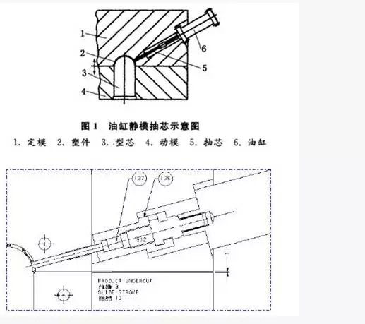 定模抽芯用油缸驅(qū)動,大大簡化模具結(jié)構(gòu),降低成本;但需注意動作順序的控制和滑塊鎖緊,以免動作錯亂損壞模具或油缸鎖緊力不足而無法封膠,抽芯力不足而抽不動滑塊。