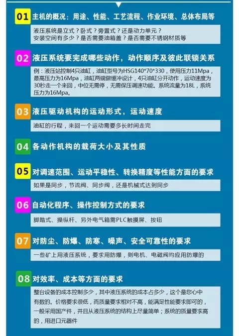當(dāng)然,還有第四種情況,您手上只有液壓系統(tǒng)的型號(hào)。按照液壓系統(tǒng)型號(hào)命名方式,有了型號(hào),我們只知道該液電機(jī)功率、閥組數(shù)、系統(tǒng)壓力,能大概報(bào)價(jià),但做出來的液壓站無法保證滿足需求,原因參考1《液壓系統(tǒng)配置過程》。
